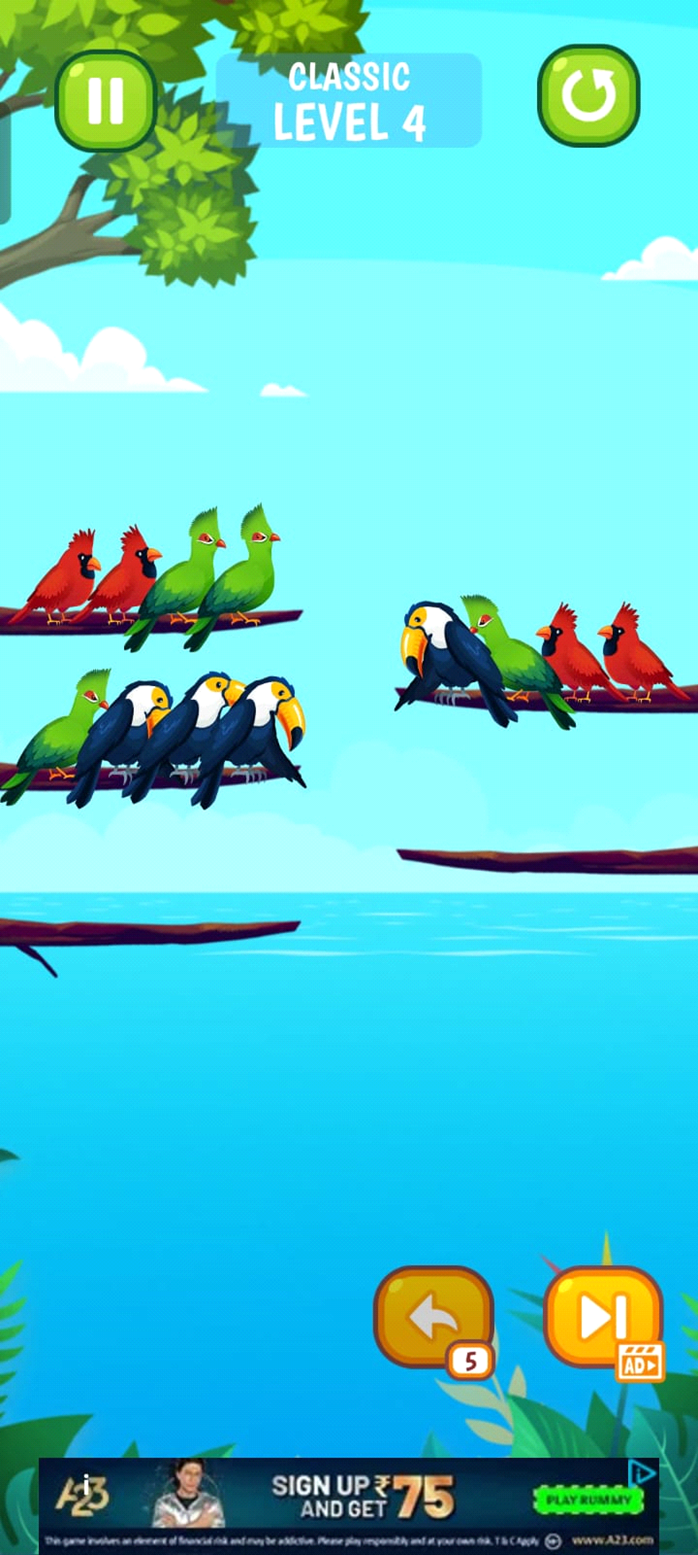 This puzzle game challenges players to sort different types of birds that are mixed up on branches. To complete each level, players must organize the birds by type, placing the same species on a single branch to remove them from the puzzle.
